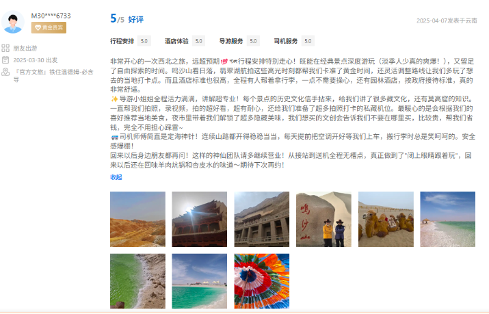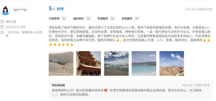 文旅國旅深度整合甘青兩地的經(jīng)典與小眾旅游資源,精心打造、上線行程豐富、體驗(yàn)舒適產(chǎn)品的同時(shí)南京運(yùn)營中心緊密圍繞游客核心需求,協(xié)同配備金牌工作人員隨團(tuán)提供專業(yè)講解與服務(wù),獲得廣泛好評(píng)。平臺(tái)數(shù)據(jù)顯示,近半年以來,其攜程店鋪訂單量同比增長超過40%,訂單完成率高達(dá)98.5%,展現(xiàn)出高度的市場(chǎng)認(rèn)可與出色的運(yùn)營效能。用戶口碑方面,店鋪好評(píng)率持續(xù)穩(wěn)步提升,目前已達(dá)4.9分,累計(jì)精選好評(píng)超千條,“質(zhì)量可信、服務(wù)可依”的品牌形象日益凸顯。