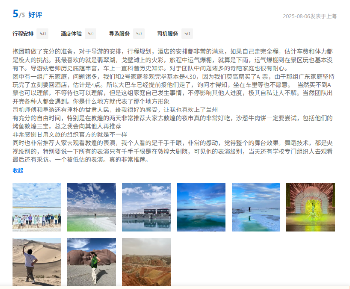 文旅國旅深度整合甘青兩地的經(jīng)典與小眾旅游資源,精心打造、上線行程豐富、體驗(yàn)舒適產(chǎn)品的同時(shí)南京運(yùn)營中心緊密圍繞游客核心需求,協(xié)同配備金牌工作人員隨團(tuán)提供專業(yè)講解與服務(wù),獲得廣泛好評(píng)。平臺(tái)數(shù)據(jù)顯示,近半年以來,其攜程店鋪訂單量同比增長超過40%,訂單完成率高達(dá)98.5%,展現(xiàn)出高度的市場(chǎng)認(rèn)可與出色的運(yùn)營效能。用戶口碑方面,店鋪好評(píng)率持續(xù)穩(wěn)步提升,目前已達(dá)4.9分,累計(jì)精選好評(píng)超千條,“質(zhì)量可信、服務(wù)可依”的品牌形象日益凸顯。